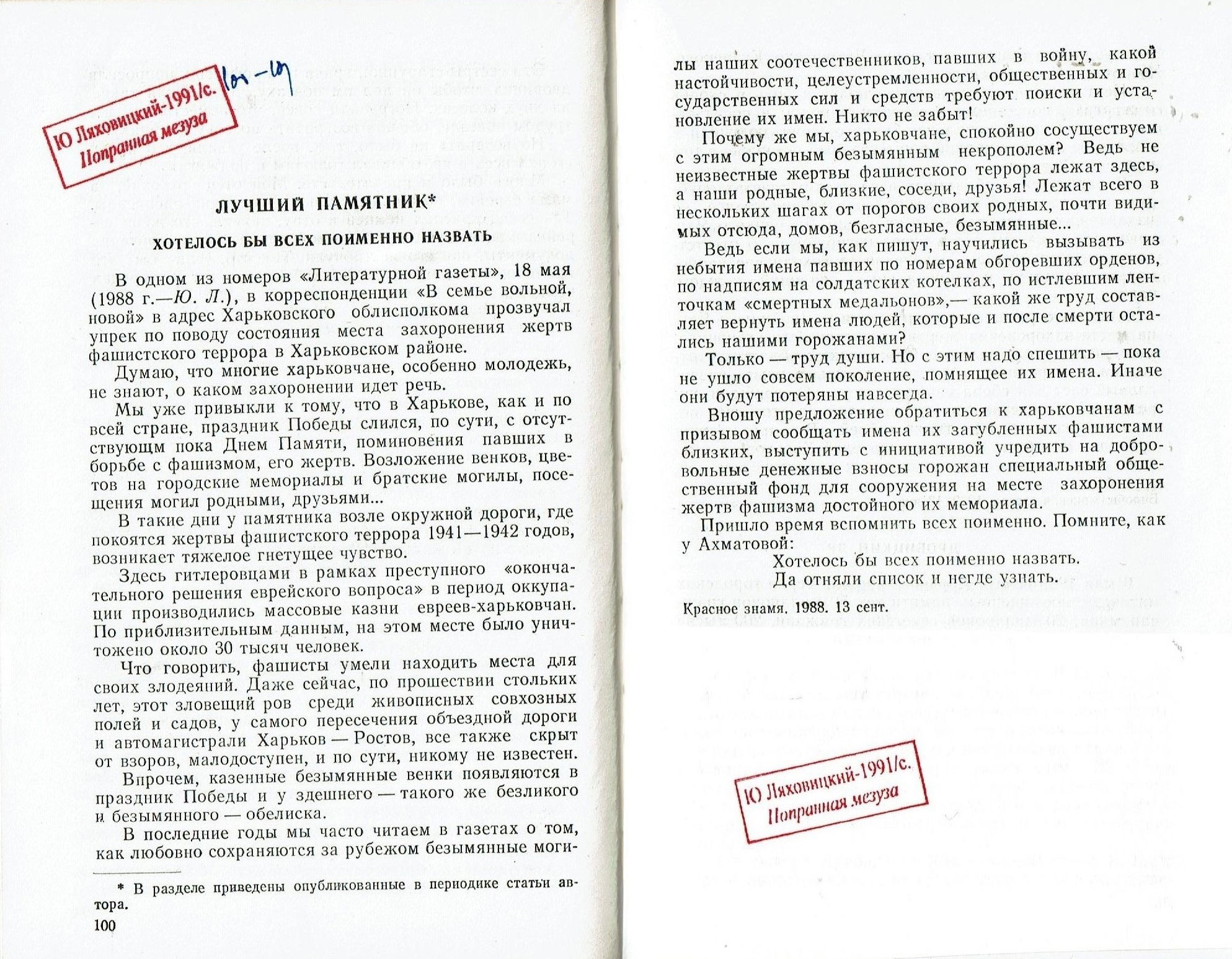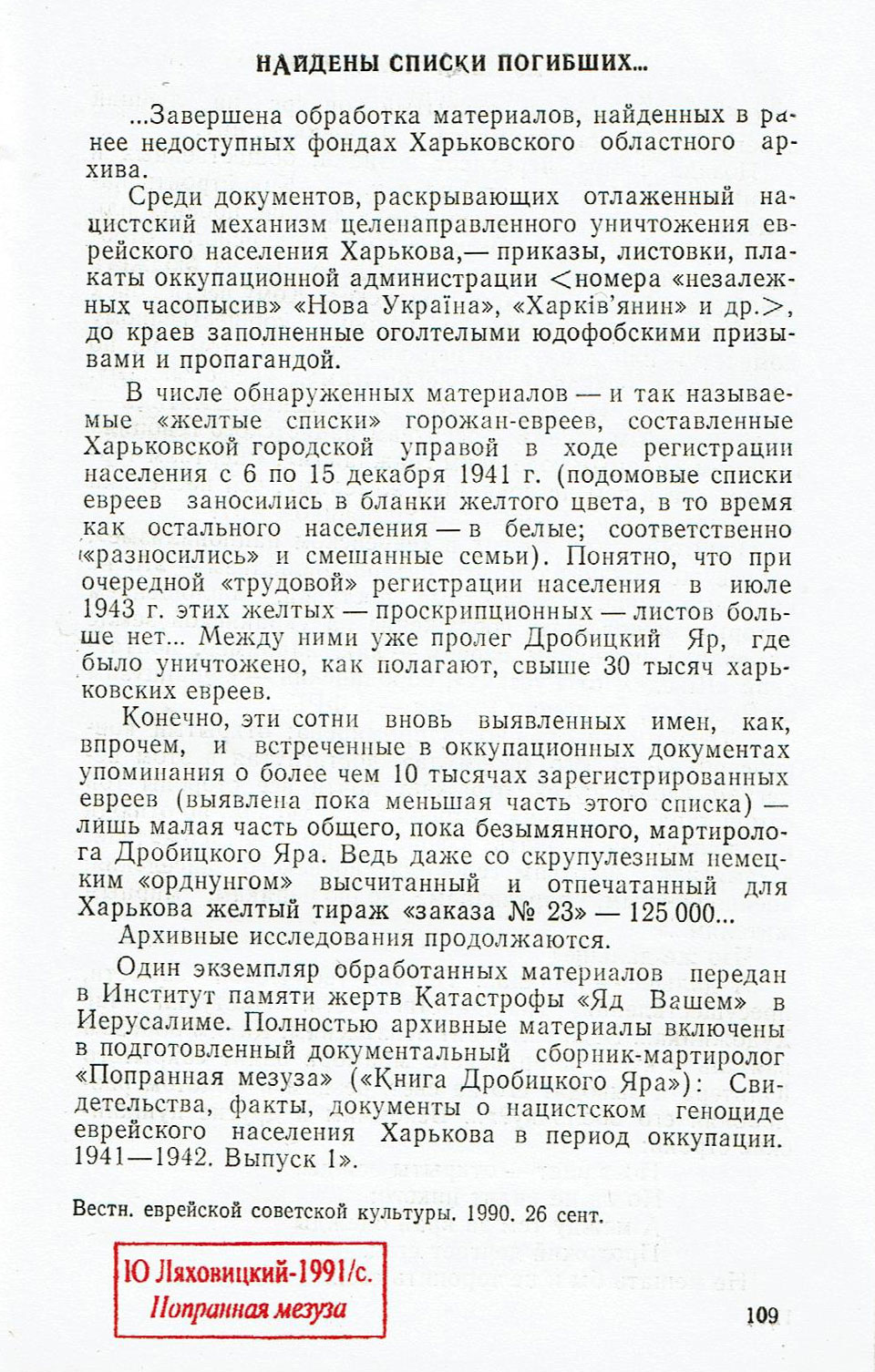Эта работа была завершена выходом в свет (при мировоззренческом содействии Евгения Евтушенко (см. фотокопию его письма) книги Ю.М. Ляховицкого «Попранная мезуза» («Книга Дробицкого Яра»): Свидетельства, факты, документы о нацистском геноциде еврейского населения Харькова в период оккупации. 1941-1942. – Харьков: Основа, 1991.-192 с.[ 24] с. ил. (Сдана в набор 12.12.90. Подписана в печать 15.03.91), ставшей пионерской по данной тематике и открывшей упомянутую книжную серию «Еврейский геноцид на Украине в период оккупации. 1941-1944». К слову сказать, издательство Харьковского университета «Основа» - единственное из 12 существовавших в то время советских издательств – которое решилось на издание этой книги (даже и «за счет средств автора», но - «в авторской редакции», в которой погребенные в Дробицком Яру «мирные советские граждане - жертвы нацистского террора» были, наконец-то, названы «евреями»).
