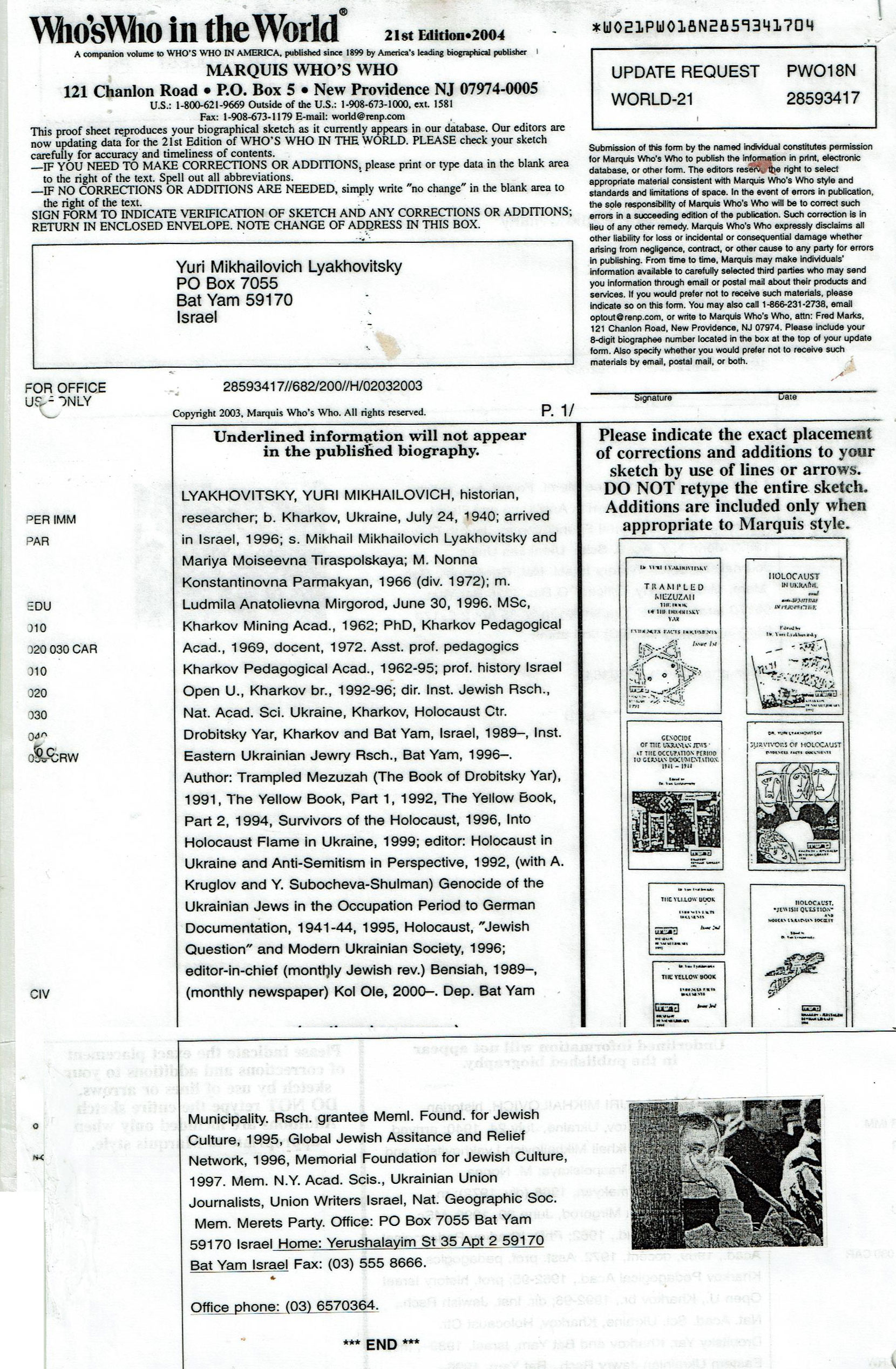Также, в июне 1991 г. (уже после выхода «Попранной мезузы») Ю.М. Ляховицкий, также по просьбе дирекции архива, оказал консультативно-источниковедческую помощь группе зарубежных составителей первого обобщенного «Списка преследуемых / пострадавших лиц, List of Jews from Kharkov who perished during the Holocaust» по Харьковской области, передав ей источниковую базу данных (Ф. Р-3746, Р-4743, Р-6245 и др.), использованную им при составлении мартиролога «Попранной мезузы», который, таким образом, был включен в упомянутый «Список», а затем и в основанную на этом «Списке» «Центральную базу данных имен жертв Шоа» Яд Вашем.